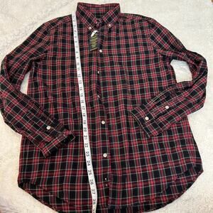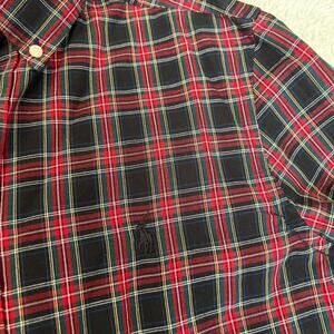 This NWT Ralph Lauren Black Plaid Button Down Shirt in boys XL or 20 with a red Polo logo is a classic and stylish addition to any young boy's wardrobe. Made of 100% cotton, this shirt features a collared neckline, long sleeves, and a regular fit. Perfect for casual occasions in all seasons, this shirt can be easily cared for by machine washing. With its preppy and American-themed design, this Ralph Lauren shirt is sure to make a statement whether worn for school, church, or everyday play.