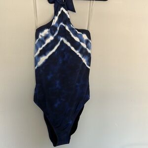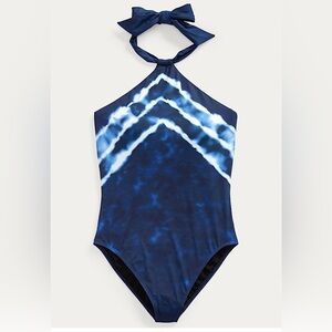 NWT Ralph Lauren Blue Shoreline Stripe Tie Dye one pice swimsuit. Blue, light blue and white. This swimwear has Tummy control and a tie at the neck. Women’s size 8! Ready for the beach or a cruise!