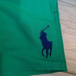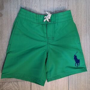 Get ready for a day at the beach with these green Ralph Lauren swim shorts in size 4. These trunks feature the iconic Polo Ralph Lauren logo and come with built-in briefs, elastic waist, and several pockets for convenient storage. The shorts are made of 100% polyester material and are machine washable for easy care.