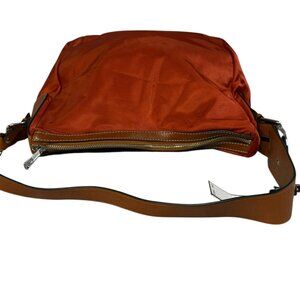 Ralph Lauren equestrian spur buckle Hobo style shoulder bag in a gorgeous burnt orange color! Nylon bag body with leather strap and accents. Zip closure with one zip pocket inside.