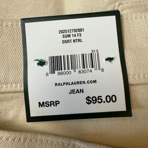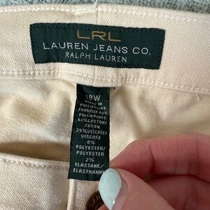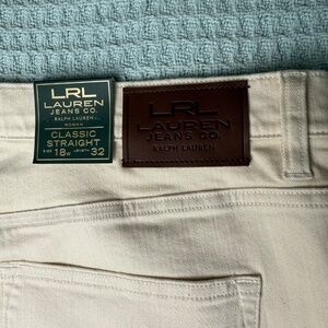 LRL Lauren Jeans Co. women’s Classic Straight jeans. Size 18W. Color is Desert Natural - cream/ivory. Zip fly and button closure. This item is new with tags; originally retailed for $95.