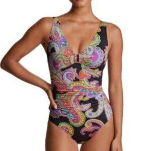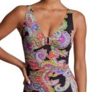 Pretty in paisley! Super chic multi color paisley one piece swimsuit from Ralph Lauren. Pull-on styling with underwire and soft cup padding for support. Allover print, over the shoulder straps with center hardware, full bottom coverage and lined. Nylon/Elastane blend, feel free to message with any questions. Thank you for shopping with us and have a great day!