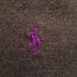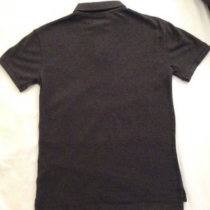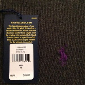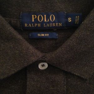 Brand new Polo by Ralph Lauren. Charcoal grey with a purple logo on the chest. Slim fit