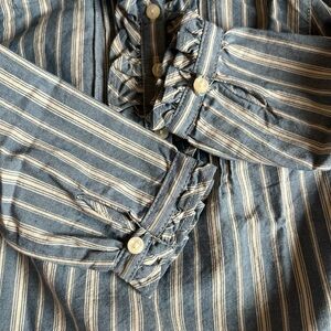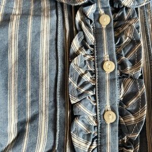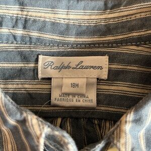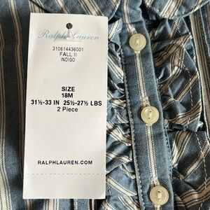 NWT Charming blue and cream striped ruffled top by Ralph Lauren. Was part of a 2 piece outfit but the top was never worn. Ruffles down the front and on the cuffs. 18 months. From a smoke free, pet friendly home.