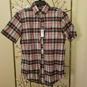 Short sleeve plaid button down shirt . This is a men's size M but is the type of shirt that looks great unbuttoned over a tank top, fitted T or even as is & low buttoned making it an excellent unisex shirt.