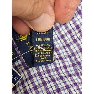 This NWT Ralph Lauren shirt is a classic button-up with a preppy twist, featuring a vibrant purple plaid pattern and a collared neckline. Made from a blend of nylon and spandex, this shirt offers a comfortable and lightweight fit that is perfect for all seasons. The embroidered accents add a touch of sophistication, making it a stylish addition to any man's wardrobe. Machine washable for easy care, this shirt is a versatile and easy-to-wear option for casual occasions.