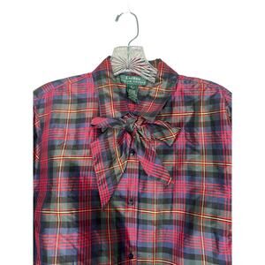 New with Tags Lauren Ralph Lauren Red Plaid Button Down Tie Front Silk Georgette Blouse.
