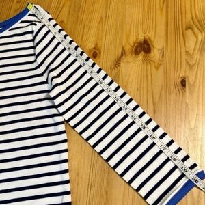 Brand new with tags! Embrace timeless nautical style with this Ralph Lauren mariner-inspired top. Featuring classic navy and white horizontal stripes, this soft knit tee includes elegant blue trim at the boat neckline and sleeve cuffs for a crisp, refined touch. Designed with 3/4 sleeves and a relaxed silhouette, it’s perfect for year-round layering or standalone wear.