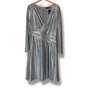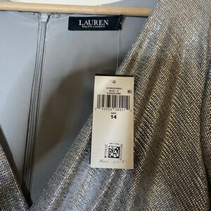 NWT Ralph Lauren Sz 14 Long Sleeve Cocktail Dress Metallic Silver Gray Faux Wrap