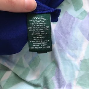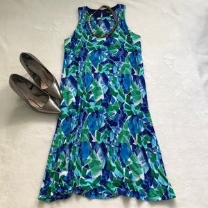 Ralph Lauren sleeveless jersey dress with a loose, swingy fit and a bright blue and green print. Pull-on style with one button closure behind the neck. Fully lined and machine washable. Polyester/elastane blend.