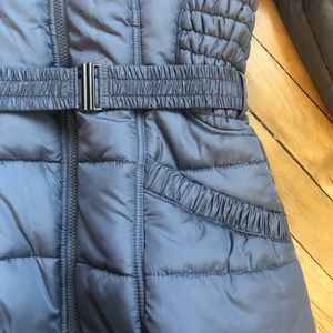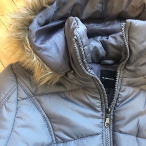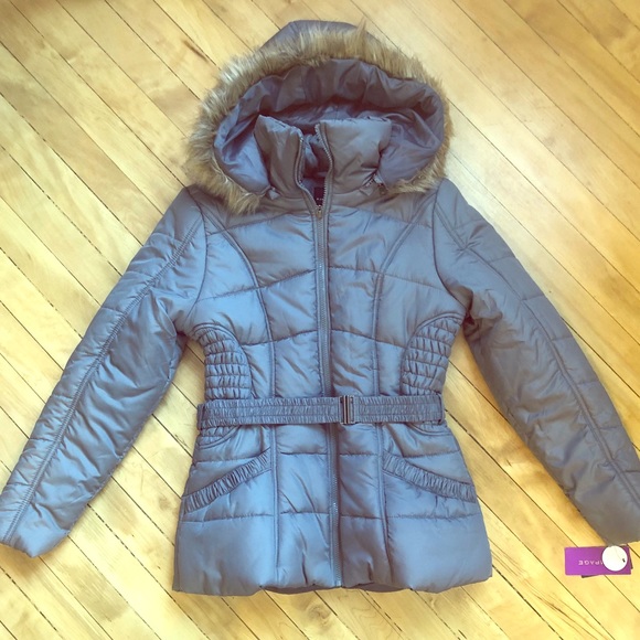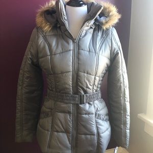 NWT Rampage grey belted puffy coat with removable hood and faux fur trim. Tags say size L, looks closer to a women’s M.