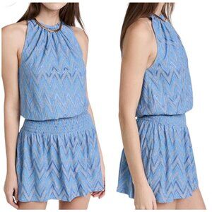 NWT Ramy Brook Blue Chevron Smocked Mini Dress Halterneck Size L