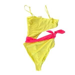 NWT Ramy Brook Color Blocked Gigi One Piece Tie Monokini Neon Swimsuit. Yellow cutout one piece bathing suit with a neon pink tie waist detail. Adjustable spaghetti straps.