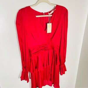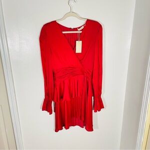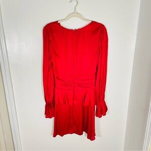 Color & Detail: True Red; V-neck, long sleeves with bell cuffs, gathered waist, tiered flounce skirt, back zipper