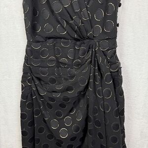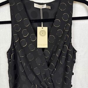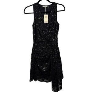 NWT Ramy Brook Desiree Silk Mini Dress Sleeveless Black w/Gold Metallic Size 00. Brand NEW. Excellent condition. Black with metallic gold circles throughout. Asymmetric wrap look hem, silk chiffon, fully lined, size zipper with covered buttons over zip, sleeveless, v-neck, wrap look waist, airy, breezy, lightweight. See photos for details and unstretched measurements. Shop my closet and bundle multiple items for discounts and one shipping fee!