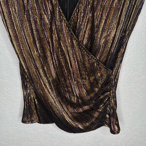 Get ready for a flirty night out with this Ramy Brook metallic striped pleated top! The gold, pink, blue, bronze, and black stripes add a touch of glam, while the wrap detail creates a flattering silhouette. Perfect for a date night, pair with black leather leggings and a peep toe pump.
