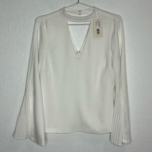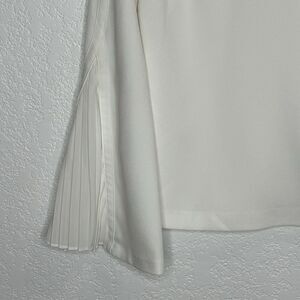 Pull on blouse with hook and eye back closures. Cutouts in front and back. Accordion bell sleeves. Stunning better -than-basic white top that will pair well with business casual, or an evening out!