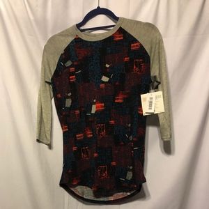 Unisex knit-T material. 3/4 length sleeve. Grey sleeves with a patterned core. Also able to be worn as a dress when the sleeves are tied around bust. XS fits sizes 2/4.