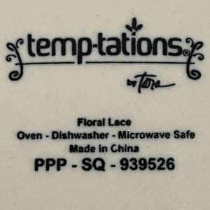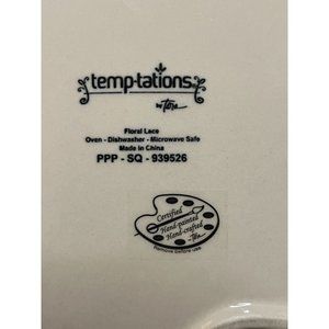 This collectible set of 3 stackable "Floral Lace" plates by Temp-tations by Tara is difficult to find. Amazingly, I have three with the original "Certified hand-painted, hand-crafted" stickers still attached and fully intact. This set is brand new and in pristine condition!