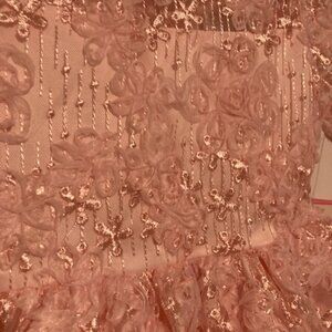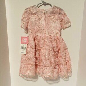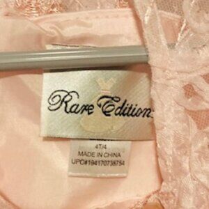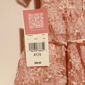 NWT Rare Editions Special Occasion Candy Carousel Dress in Toddler size 4T/4. This beautiful pink dress features short sleeves, lace and floral embellishments, tiered skirt lined underneath with tulle for a small amount of volume and a zipper and button closure in the back. The fabulous tiered skirt is lined with tulle for a small amount of volume and there is lining between the tulle and your little one's legs.