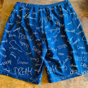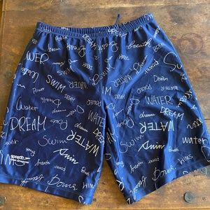 These super fun lycra swim shorts are a rare collaboration between designer comme des garçons and speedo and feature the signature print. They are new with tags, have a liner to keep the boys warm and cozy, and an adjustable draw string waist. Size 34" waist, about 18.5" long. Color is Navy Blue and White Great for travel - they dry super quickly and pack up small! These are sold out everywhere online.