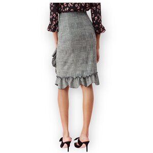 Menswear-inspired glen plaid tailored pencil skirt with ruffles around hem line and side.