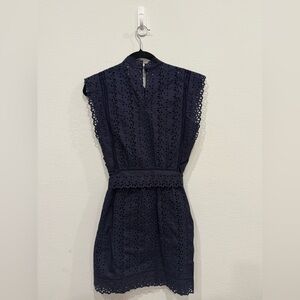 Chic navy mini dress with eyelet detailing, featuring a tie waist for a flattering silhouette. Perfect for versatile styling.