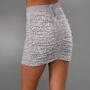 New, never worn ruched leopard print jersey mini skirt. Unfinished edge at cascading front ruffle. Exposed back zip and elastic waistband. Lined. XS (equivalent to 0 or 2.) 16" long. Got it on sale at Bloomingdale’s for $156, originally $195.