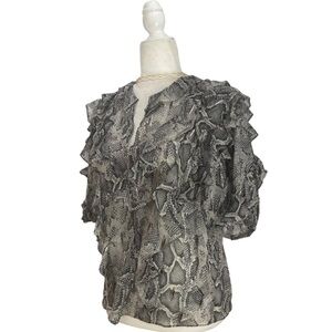 Stunning NWT Rebecca Taylor Ruffled Snake Skin Silk Blouse featuring short elbow length elasticized sleeves, optional V Neck or keyhole neckline silhouette, flirty ruffles and metallic accents. Semi sheer. A Showstopper!