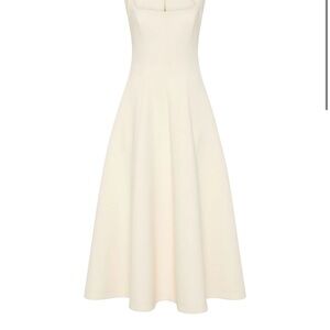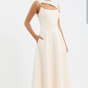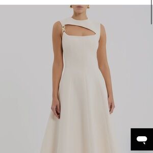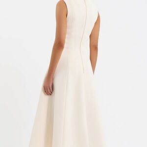 The Freyja Midi Dress radiates modern elegance in cream. Tailored from bonded crepe, its fit-and-flare silhouette is accentuated by an asymmetrical bodice and open neckline, adorned with gold art deco trim. Polished and refined, this lined dress is finished with an exposed zip fastening at the back, making it an ideal choice for your next special event.