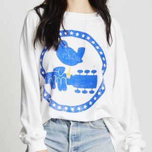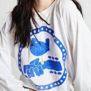 We’re binging all 3 days of peace & music in this vintage style Woodstock sweatshirt! Our bold graphic sweatshirt is designed with the iconic bird and guitar logo on the front with, “3 Days Of Peace & Music” type on the back. Made with soft vintage washed fabric, our perfectly oversized sweatshirt is finished with a relaxed crew neckline, and ribbed hems.