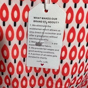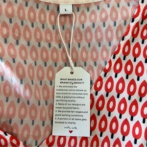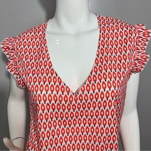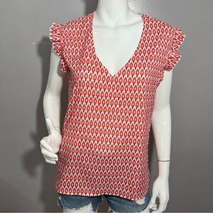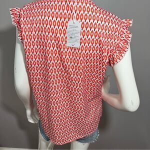 No designer name on the garment anywhere. Tag states that top is made with recycled material. Super cute top that is perfect for business casual or pair with jean shorts for a boho look. Graphic print orange and white design. V-neck and flirty ruffle sleeves.