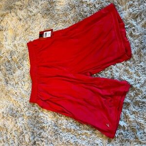 These vibrant red athletic shorts are designed for optimal comfort and movement, featuring a lightweight synthetic material and a secure elastic waistband. Ideal for sports and active wear, they offer a loose fit that ensures ease during any activity. Size large