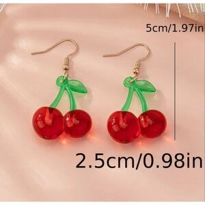 NWT Red Cherries With Green Leaves Fun Fruit Dangle Drop Acrylic Earrings.