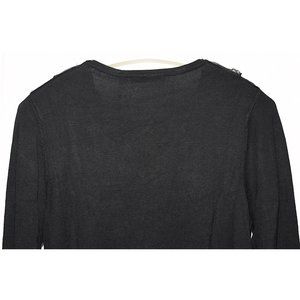 New, never worn. Luxuriously soft fabric. Romantic chiffon ruffle at neckline (attached). Scoop neck that's close to a V-neck but still rounded. Nips in at waist.