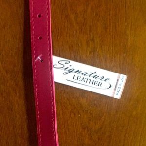 NWT Red 100% Leather Dog Collar. 16”. Perfect condition- never used. Nickel hardware with D ring for leash attachment. Leather is soft with red sturdy stitching.