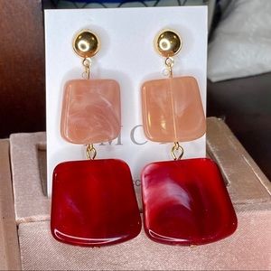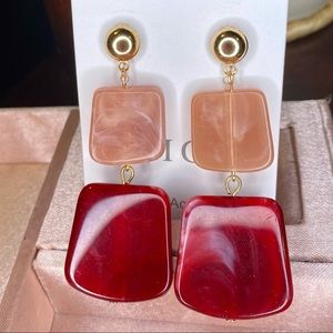 Red resin acrylic geometric square drop earrings with gold-tone bauble ball detail and post back closure. Costume jewelry- alloy metal.