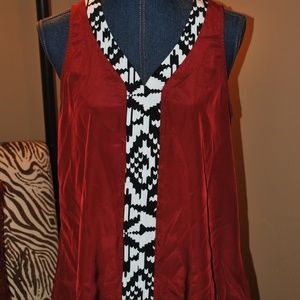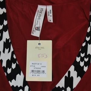 NWT Pink Owl sleeveless V-neck blouse. Deep Red with Black/white print around V and down front. Size: Medium.