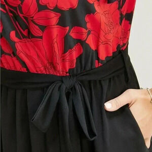 Classic style, V-neck, black and red floral , print, belt, elastic waist, mesh skirt overlay, pockets, big enough for a cell phone,lined