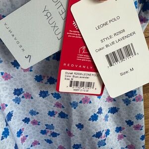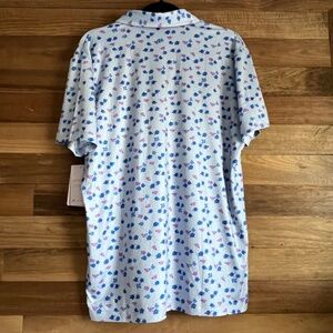 The Leone Polo features a muted floral backdrop heightened by sporadic and colorful flower bursts throughout. Spread self collar and 3 button placket front closure.