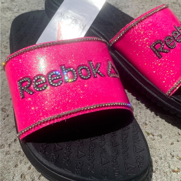NWT Pink Reebok slides . Pink iridescent glitter background, along with high quality glass rhinestones . These look absolutely amazing especially in the sunlight . Size 5 . Thanks for looking :)