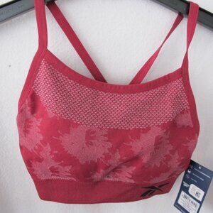 New with tags - Women's Reebok Sports Bra - Size Small. Seamless style sports bra with removable pads and adjustable strappy back. Burgundy coloring.