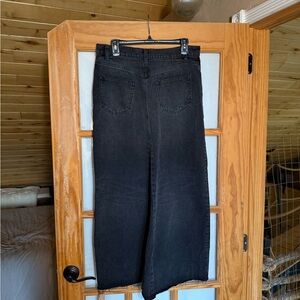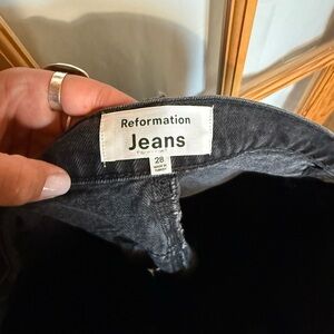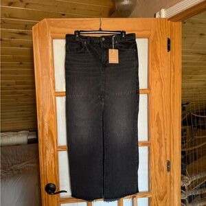 This Reformation black denim midi skirt offers a sleek and versatile look with an edgy twist. Designed with a high-waisted fit, raw hem, and a subtle front slit, it combines structure with casual ease. The classic five-pocket design nods to traditional denim styling, while the unfinished edges bring a touch of modern edge. Perfect to pair with tanks, blouses, or sweaters, this skirt transitions easily from day to night.