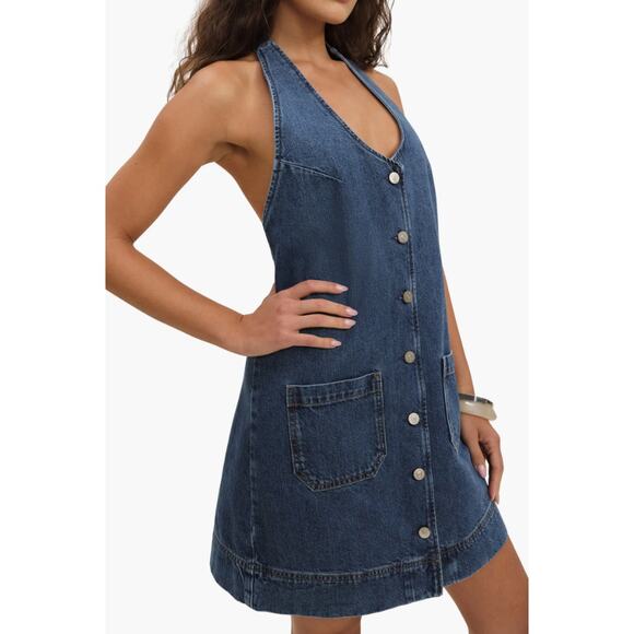 Meant to show off your shoulders and back, this nonstretch denim dress is cut in a leggy length and perfected with a pair of patch pockets.