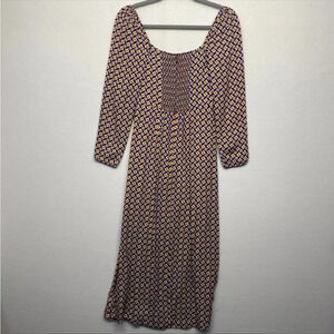New with tags. Tiny spot near waist on front. Not noticeable unless inspecting due to bold print. Measurements in pics.