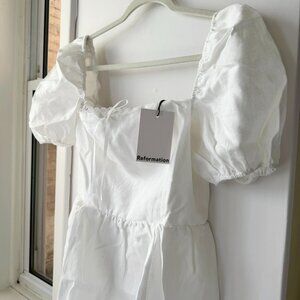 Reformation white linen mini dress with puff sleeves, curved neckline, and front tie detail in 100% linen. MSRP $248 (pit to pit: 16.5 in, waist: 14.5 in, length: 27 in)