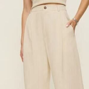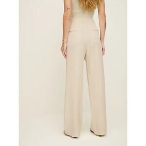 belt loops, front buttons, finished hem, pleated details, side pockets, and zipper fly.