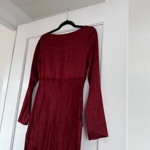 Reformation Naila Satin Dress In Chianti Slim Fit Thigh High Slit Long Sleeves