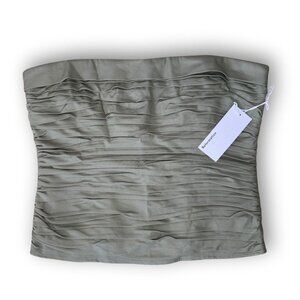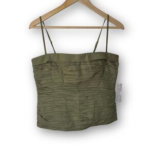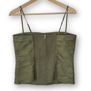 The Orion is a fitted, removable strap top with smocked detailing, a back zipper, and a ruched design. In a beautiful olive green color. New with tags, never worn, perfect condition. Size 10. Made with organic cotton. Sold out at Reformation.