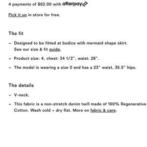 The model is wearing a size 0 and has a 23" waist, 35.5" hips.